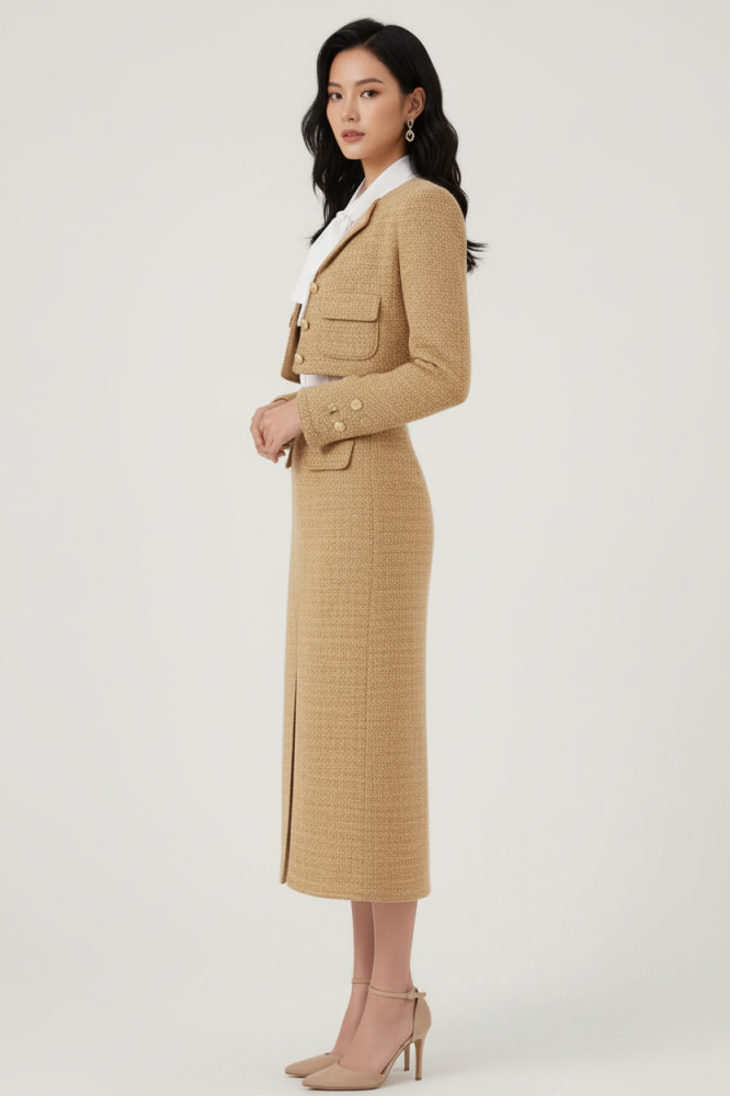 • طقم جاكيت وتنوره بتصميم شتوي أنيق يناسب الإطلالات الرسمية