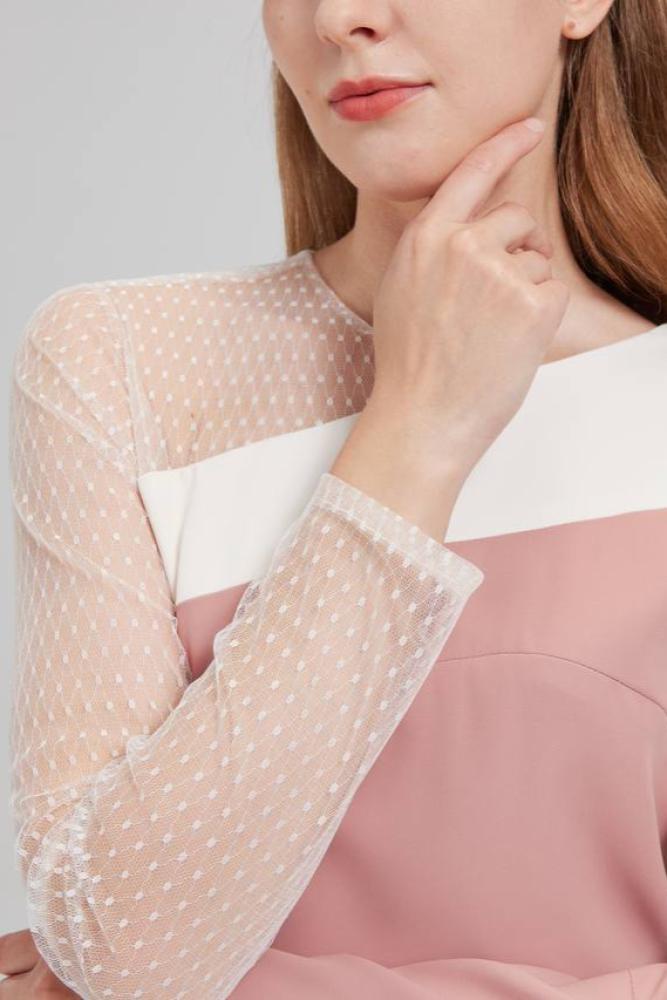- الأكمام: شفافة بطول متوسط لمظهر أنثوي ناعم