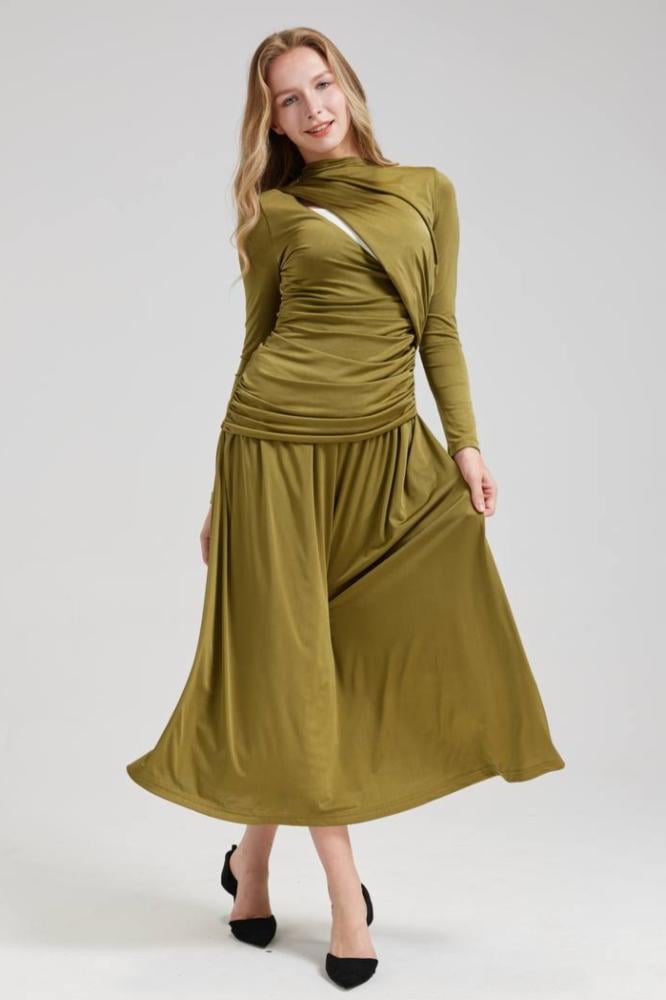 - قصة العنق: ملفوفة (Draped neckline).