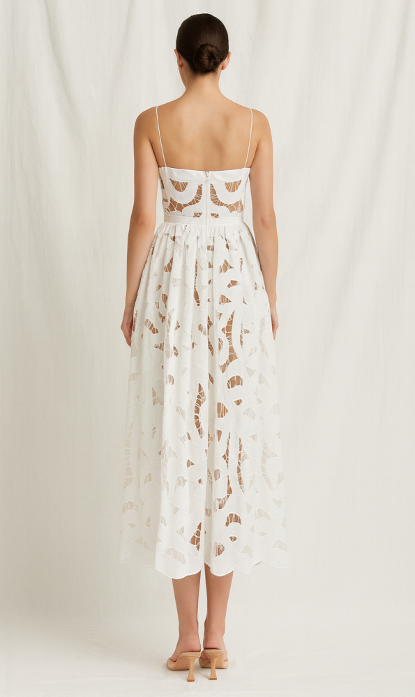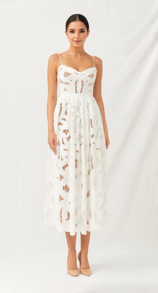 Embrace elegance with this sleeveless white lace dress featuring elegant lace detailing. This dress is the perfect choice for every woman seeking a touch of sophistication and femininity. The pure white color of the dress exudes a sense of purity and freshness, making it suitable for a variety of occasions.