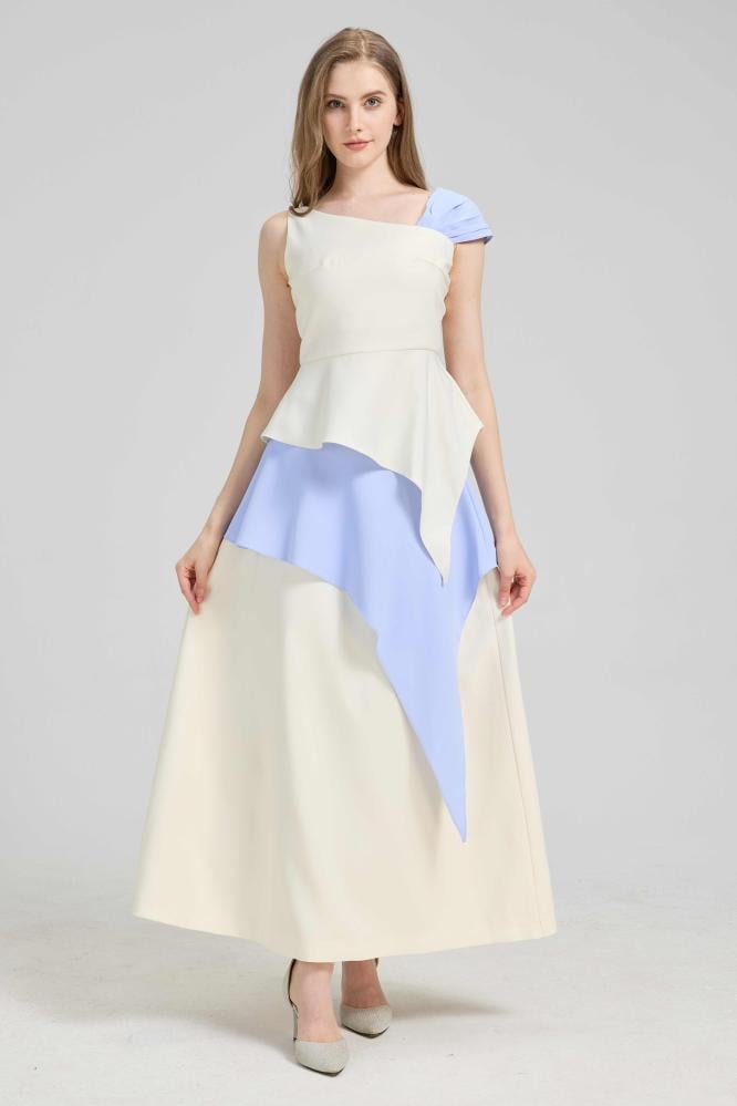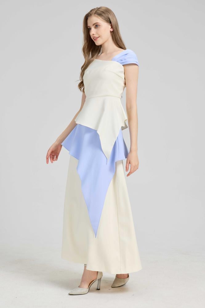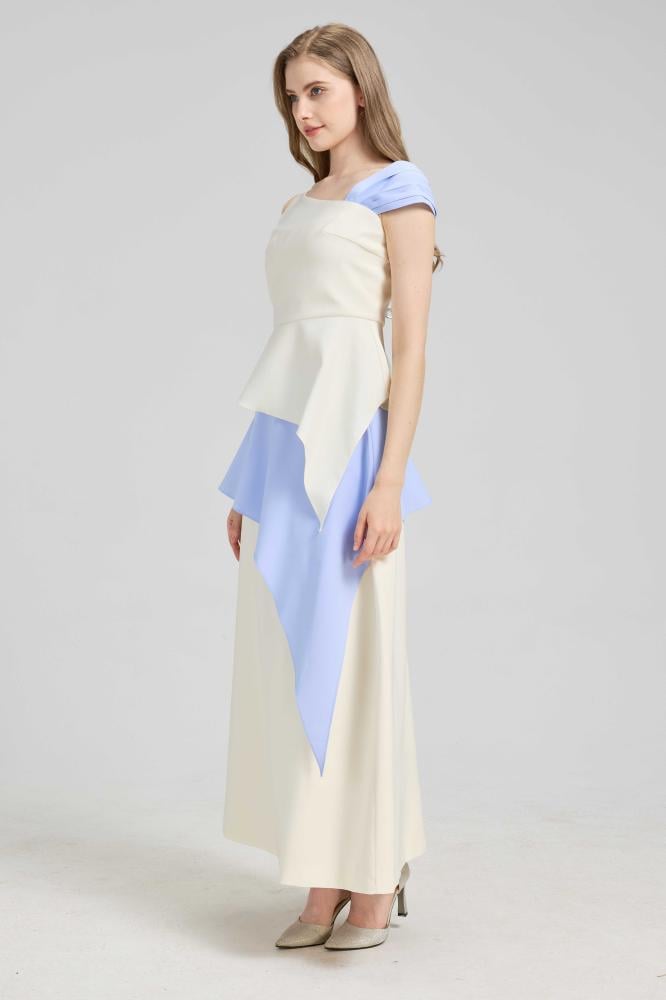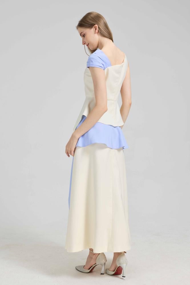 - Sleeves: Short sleeve on one shoulder only, decorated with a light pleat or ruffle in sky blue, while the other shoulder is completely exposed.